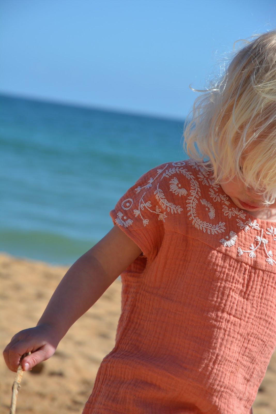 het bloesje van joske is gemaakt in Double gauze Nude met een geborduurd pasje...